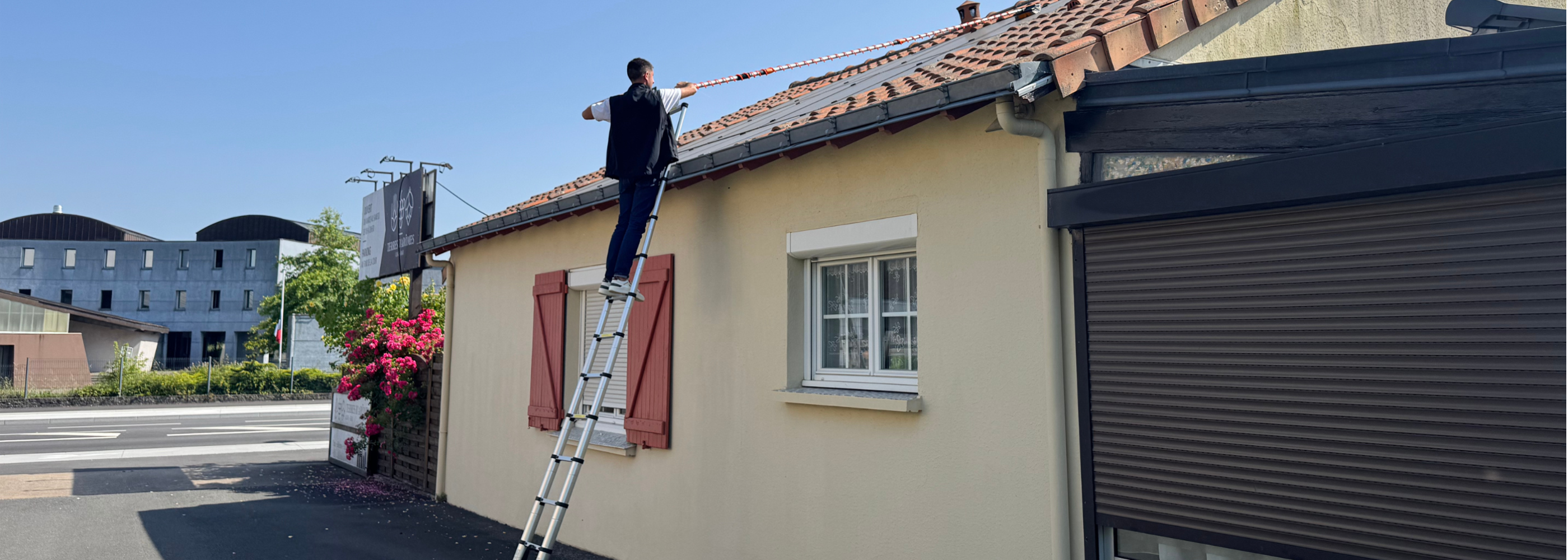 ou des panneaux photovoltaïques, dont l’entretien régulier est indispensable pour optimiser la récupération énergétique. La perche télescopique accessoirisée permet un entretien régulier, comme l’élimination de dépôts comme le pollen ou un déneigement rapide.