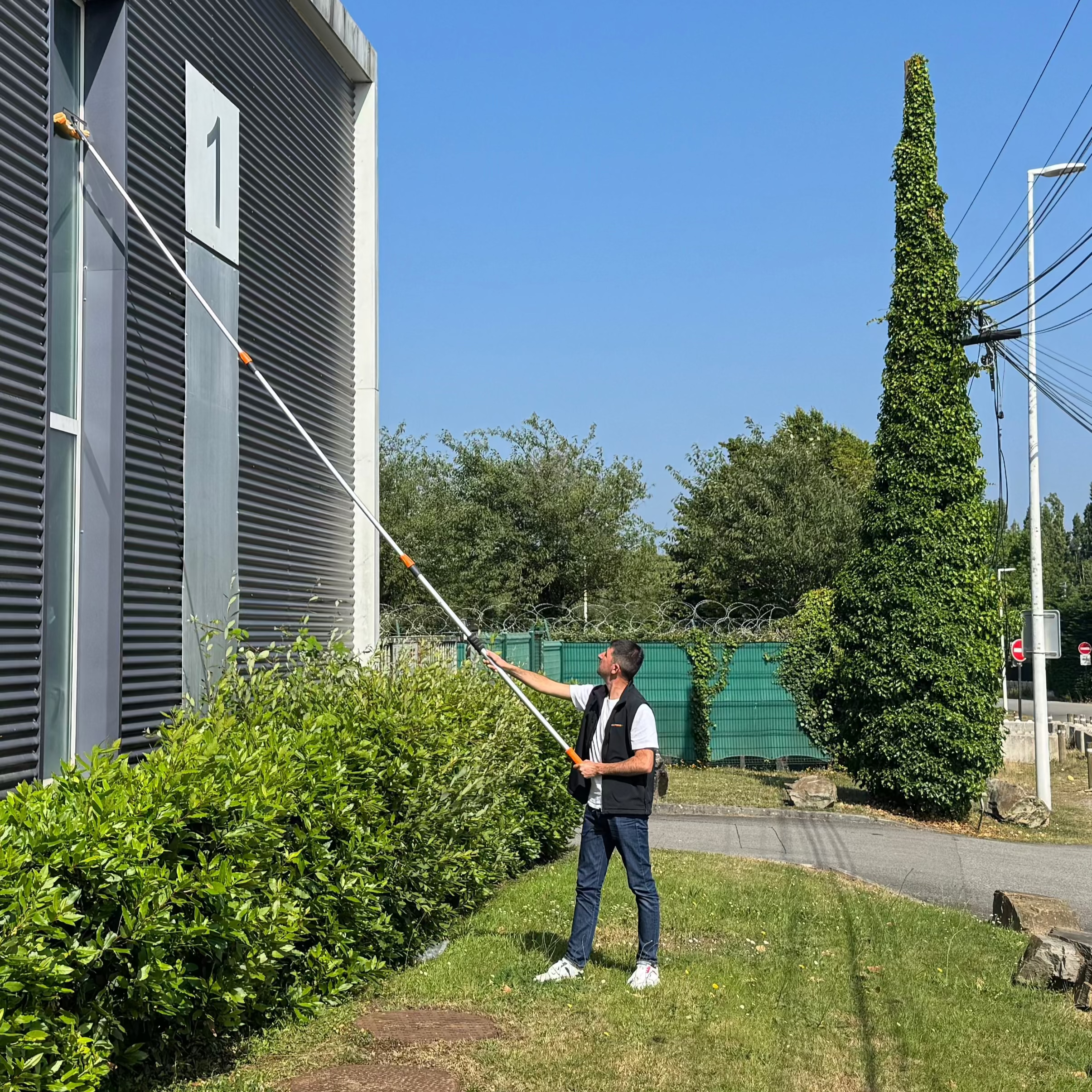 Nettoyez vos vitres en toute sécurité, les pieds bien au sol. Grâce à notre perche télescopique plus besoin d’échelle.